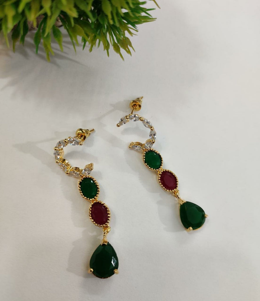 Sale package : 1 pair of earrings Color : Gold with red and green AD stones Earring type : Dangler with push back Disclaimer : Product colour may slightly vary due to photographic lighting sources or your monitor settings. Jewellery Care : Keep it away from perfume/Sprays and water.Use airtight box to store the jewellery.