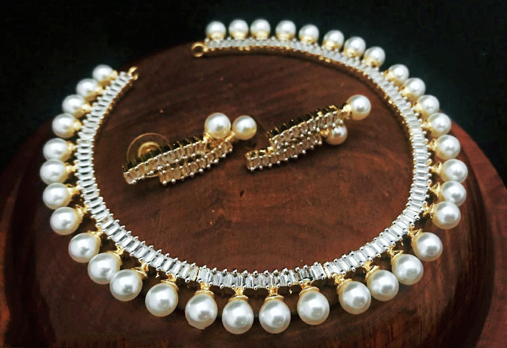 Sale package : 1 necklace and 1 pair earrings Color : AD stone with white pearls Disclaimer : Product colour may slightly vary due to photographic lighting sources or your monitor settings. Jewellery Care : Keep it away from perfume/Sprays and water.Use airtight box to store the jewellery.