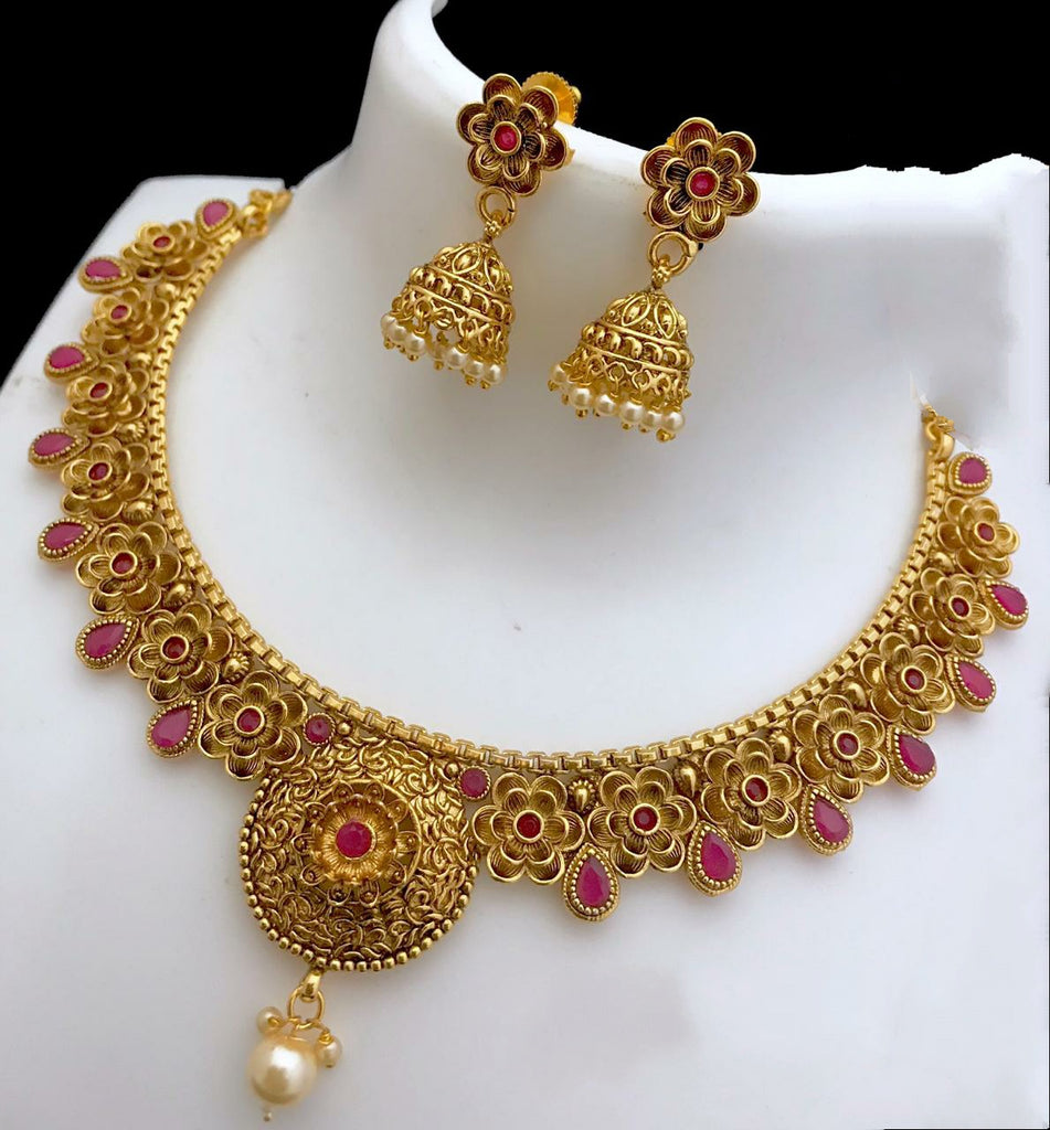 Sale package : 1 necklace and 1 pair earrings Color : Antique golden Disclaimer : Product colour may slightly vary due to photographic lighting sources or your monitor settings. Jewellery Care : Keep it away from perfume/Sprays and water.Use airtight box to store the jewellery.