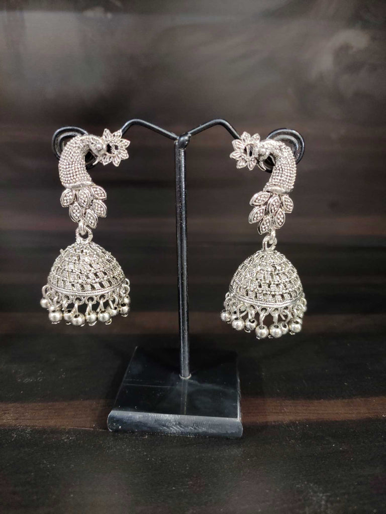 Sale package : 1 pair of earrings Color : Silver Earring type : Peacock top jhumkas Disclaimer :Product colour may slightly vary due to photographic lighting sources or your monitor settings. Jewellery Care:Keep it away from perfume/Sprays and water.Use airtight box to store the jewellery.